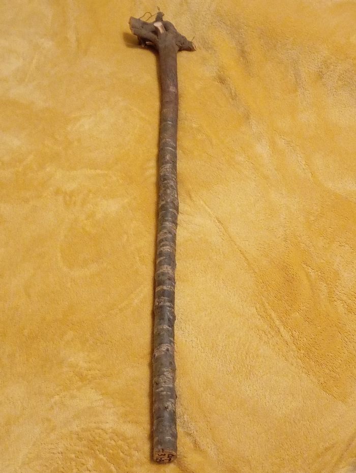 Amellett, hogy az úr nagyon segítőkész volt és csak egy kis jelképes összeget kért a botért, olyat küldött nekem, ami már azonnal faragható. Akár túrabotot, akár sétapálcát készít az ember annak az a jó, ha télen szedik le a hozzávalót és a szedés után 3-4 évig saját kérgében szárad. Vagyis elteszik egy sarokba és majd 3-4 év után hozzákezdenek. Itthon lehet, hogy 2 év is elég, mivel nálunk kisebb a páratartalom. De mindegy is, a lényeg, hogy nem kell várnom és ez nagyon jó hír. A botkészítők körében ez már ebben a formában is egy értékes darab.